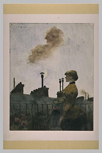 Jeune femme debout sur un balcon, contemplant des toits parisiens