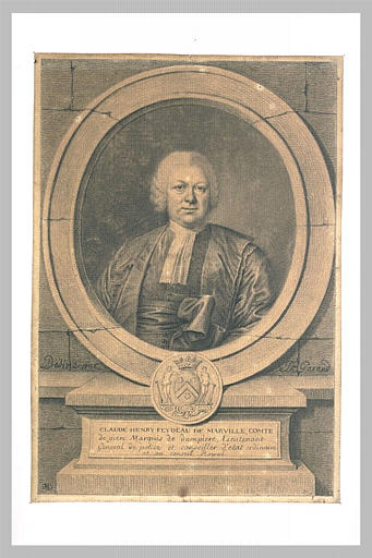 Encadrement figurant un oeil-de-boeuf. Sur la console, inscription suivante : Claude Henry Feydeau de Marville, comte de Gien, marquis de Dampierre (sic), lieutenant général de police et conseiller d'Etat ordinaire et au conseil royal. Annotation : Dessiné par J.B. Garand