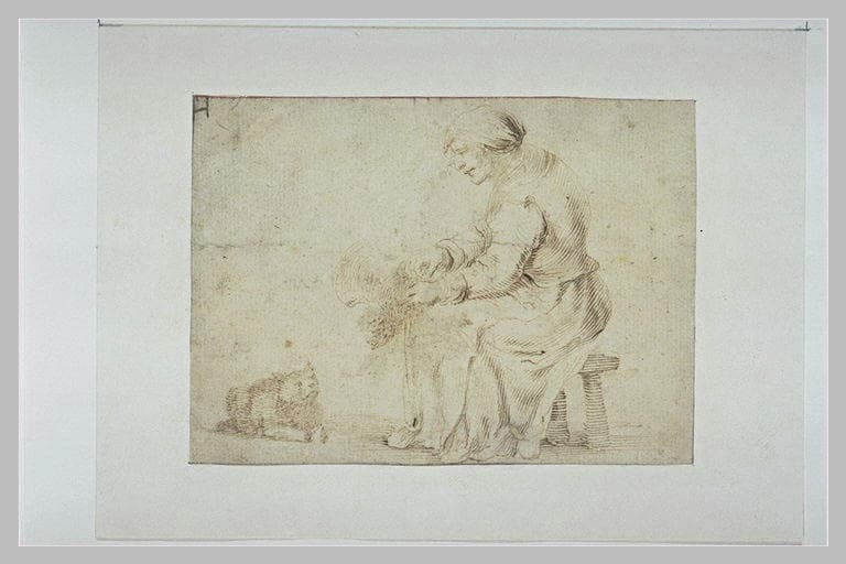 Femme assise, de profil, plumant une volaille devant un chat attentif