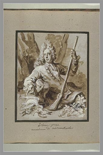 Album Oudry Jean-Baptiste -1-, folio 18, dessiné au recto ; Album oblong relié en veau brun, comportant une page de garde blanche et 39 feuillets gris-bleutés, numérotés de 1 à 110 (sic) : effectivement, ces ombreux feuillets ont été découpés et initialement l'album était composé de 122 feuillets. Au verso de la reliure, inscription à la plume :2 vol. fol. avec 107 différentes attitudes de portraits par J.B. Oudry. H : 0, 260 ; L : 0, 317 ; Inscription, à la plume et encre brune, en-dessous :dessein pour monsieur de Nedonchelles (sic)