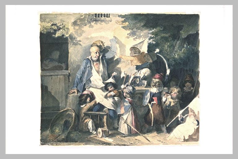 Groupe d'enfants jouant avec un vieillard : La perruque enlevée