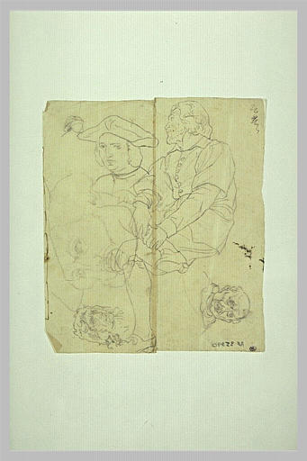 Marque de la collection Horace Paul Delaroche en bas, à droite (Lugt 1301). Papier calque fortement plissé, et déchiré. Etude pour les figures de l'hémicycle de l'Ecole des Beaux-Arts, à Paris.