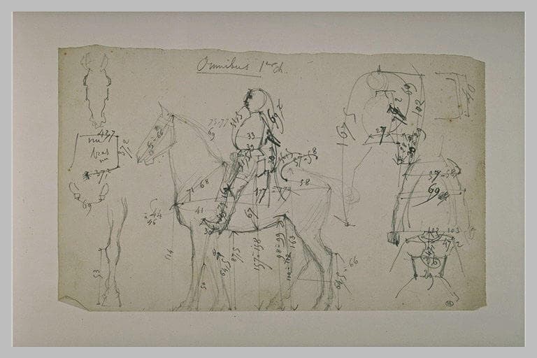 Feuille de croquis, cotés, pour une statue équestre de Jeanne d'Arc