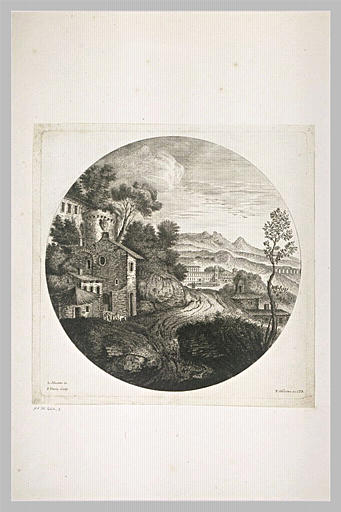 Paysage avec deux voyageurs et diverses constructions dont des aqueducs