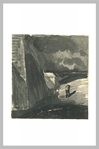 Devant des fortifications un couple debout, enlacé, la nuit