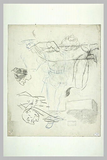 Croquis de têtes, silhouettes de militaire, et d'une femme en buste