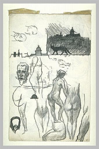 Etudes : chat noir et ville, têtes d'hommes, tête et corps de femmes