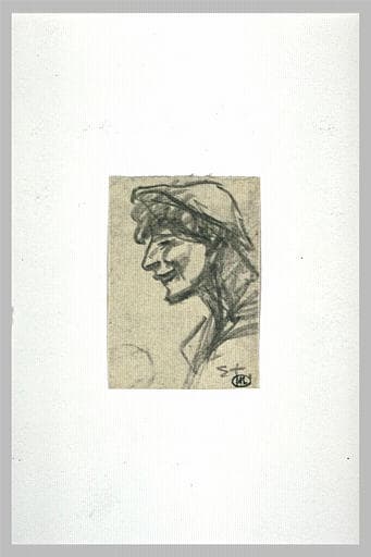 Tête grimaçante, coiffée d'un béret, de profil vers la gauche