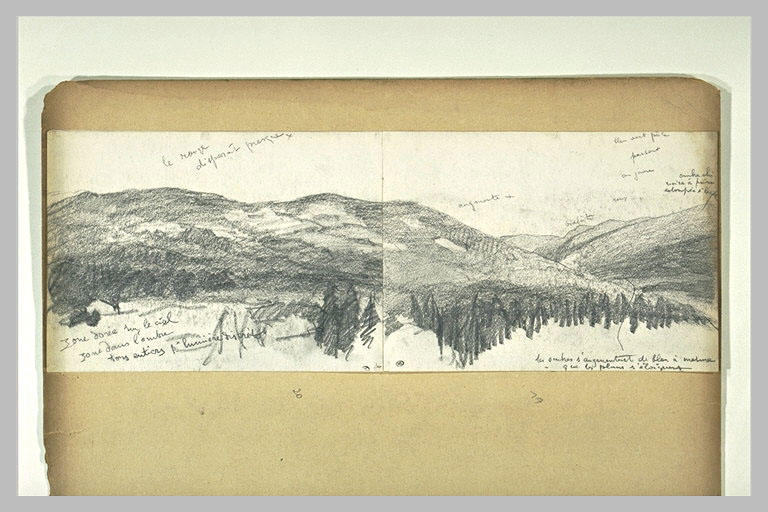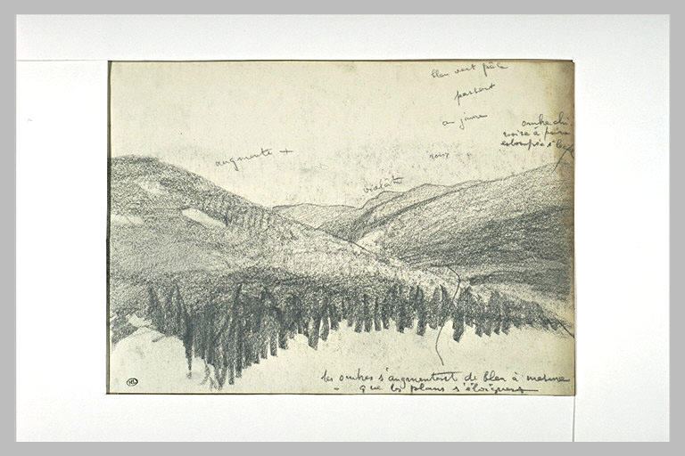 Annotations en haut : augmente violâtre bleu vert pâle passant or jaune roux ombre chinoise à peine estompée à la cime. En bas : les ombres s'augmentent de bleu à mesure que les plans s'éloignent. Ce dessin se poursuit sur le dessin RF 33277.