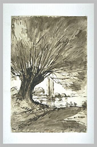 Paysage : grand saule domine les rives d'un plan d'eau, et trois baigneuses