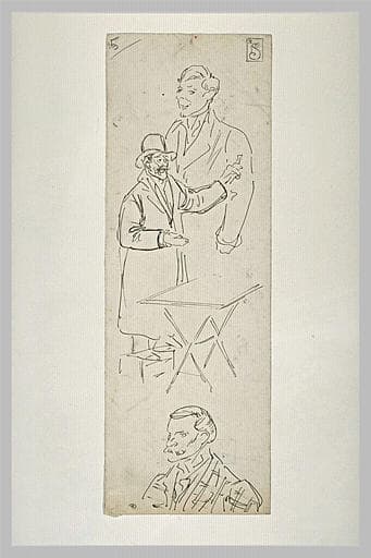 Deux bustes d'homme, et un bonimenteur derrière une petite table