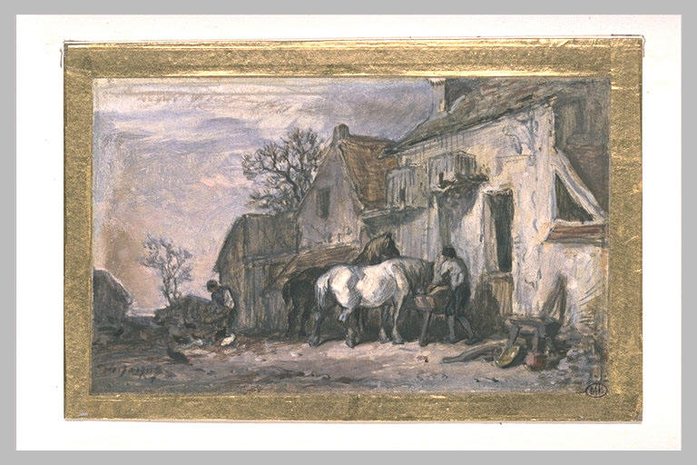 Hommes et chevaux à l'abreuvoir dans une cour de ferme