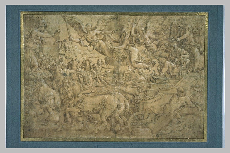 Ce dessin fait partie d'une série de cartons de tapisserie illustrant le Triomphe de Scipion l'Africain (Hartt. fig. 479)