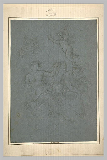 A.J. Dezallier d'Argenville, numéro 184 et paraphe (L.2951) en bas à gauche et annotation à la plume et encre brune sur le montage en bas au centre : Romanelli ; sa vente, Paris, 18-28 janvier 1779, partie du lot 68 (Romanelle) -- Lenglier -- Ch.P. de Saint-Morys, annotation à la plume et encre brune sur le montage : Ecole Romaine -- Saisie des biens des Emigrés en 1793, remise au Museum en 1796-1797 ; marque du Louvre (L.1886-a).