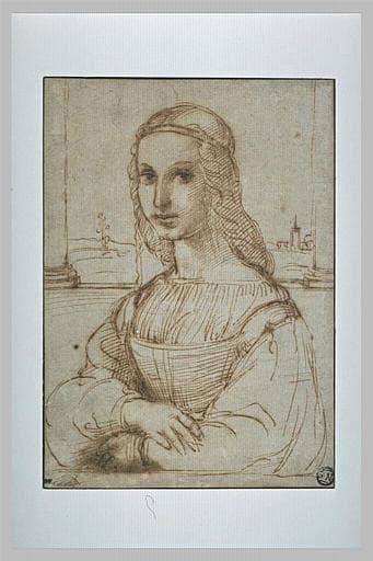 Etude pour un portrait peint, peut-être la Dame à la licorne à Rome, Galleria Borghese, peint par l'artiste vers 1507 (D. Cordellier, B. Py, Musée du Louvre - Inventaire des dessins italiens - V. Raphaël, son atelier, ses copistes, Paris, 1992). Ce dessin s'inspire de la Joconde de Léonard de Vinci (Paris, Musée du Louvre) dont l'exécution est diversement située entre 1500-1501, et 1513-1515. Il est également rapproché du Portrait de Costanza Fregoso, conservé en collection privée, publié par M. Lucco (A New Portrait by Raphael and Its Historical Context, Artibus et Historiae, n° 41 (XXI), 2000, pp. 49-73) comme une oeuvre de Raphaël datant de 1507