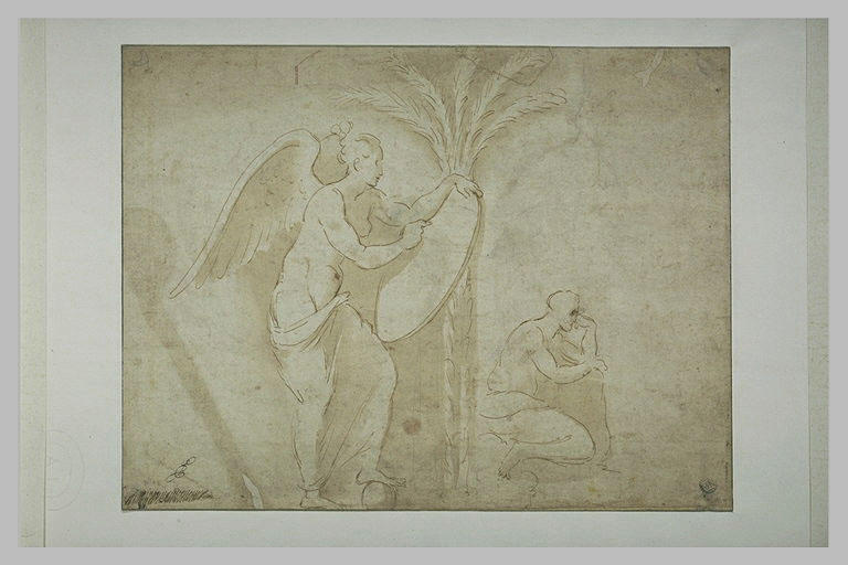 Etudes, par un artiste de l'atelier de Raphaël (Giulio Romano ?), d'après des motifs empruntés à des monnaies romaines d'époque impériale et en relation avec les recherches pour les stucs des Loges. Le motif de la Victoire se retrouve dans un stuc du pilastre I. B des Loges et, avec variantes, dans le décor de la loggetta du cardinal Bibbiena, Vatican. D. Cordellier, B. Py, Musée du Louvre - Inventaire des dessins italiens - V. Raphaël, son atelier, ses copistes, Paris, 1992, N° 790.