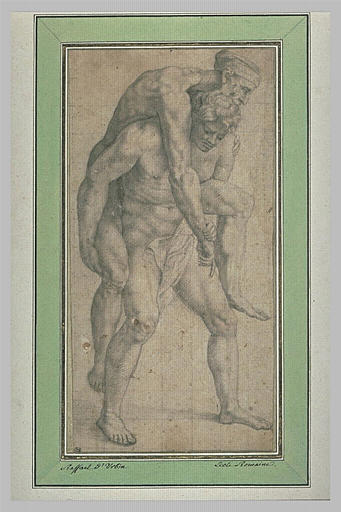 Copie d'après Enée et Anchise dansl'Incendie du Bourg , composition de la Chambre de l'Incendie du Bourg. D. Cordellier, B. Py, Musée du Louvre - Inventaire des dessins italiens - V. Raphaël,son atelier, ses copistes, Paris, 1992.