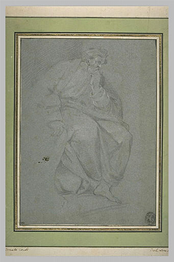 Copie d'après la figure dans le Partage des Terres, composition de la voûte de la Xe travée des Loges. Peut-être de la même main que les dessins du Musée du Louvre INV 4085, 4096, 4097, 4098, 4100,4101, 4165, 4168, 4174, 4178, 4179, 4180, 4181, 4222, 4234, 4236, 13841, 13916 et sans doute les dessins INV 4213, 4214, 4220. D. Cordellier, B. Py, Musée du Louvre - Inventaire des dessins italiens - V. Raphaël, son atelier, ses copistes, Paris, 1992.