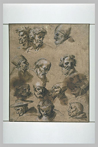 Copie d'après deux figures de la partie inférieure gauche de la Dispute du Saint Sacrement, composition de la Chambre de la Signature. D. Cordellier, B. Py, Musée du Louvre - Inventaire des dessins italiens - V. Raphaël, son atelier, ses copistes, Paris, 1992.