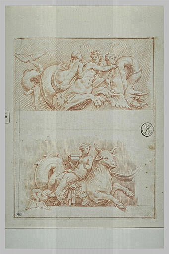 Copie, par Nicolas Vleughels ou son atelier, d'après des bas-reliefs antiques (Méjanès, 1983, p. 179 Ors. 756). Même motif dans le dessin du Musée du Louvre INV 4242. D. Cordellier, B. Py, Musée du Louvre - Inventaire des dessins italiens - V. Raphaël, son atelier, ses copistes, Paris, 1992