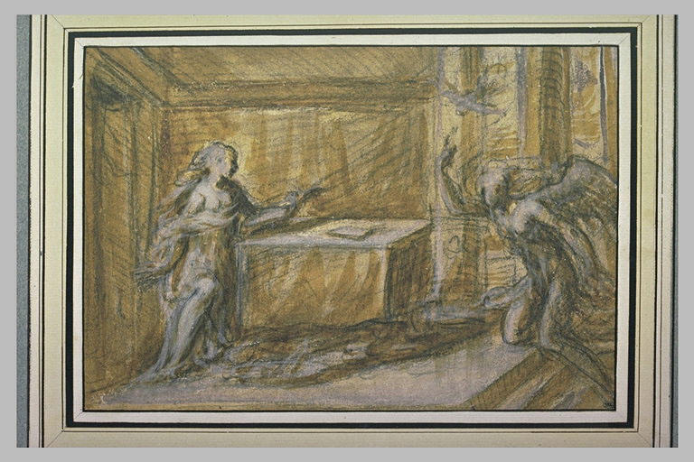 On peut rapprocher cette étude de la petite peinture autrefois intégrée dans le barco de l'église dei Carmini, aujourd'hui placée dans les tribunes du choeur situées de part et d'autre de la nef, où la Vierge, l'ange et le Saint Esprit sont placés dans les mêmes positions. Dessin étudié par F.L. Richardson, Andrea sciavone, Oxford, 1980, n° 191, fig. 183 ; D. McTavish, dans cat. exp. The Genius of Venice, Londres, Royal Academy, 1983, n° D 54. Un dessin de la Vierge seule est passé en vente chez Christie's, Londres, 10 VII 2001, n°34 (Schiavone).