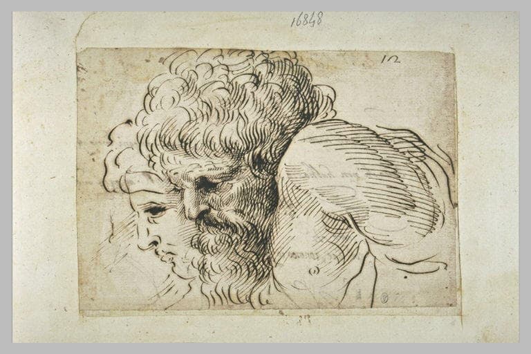 Deux têtes groupées, vues de profil, tournées vers la gauche