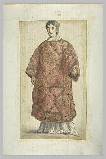 Un ecclésiastique revétu d'un habit brodé : un diacre?