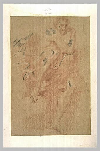 Homme nu, assis sur une draperie, de face, accoudé sur le bras droit