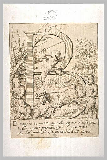 La lettre B ornée de quatre enfants nus et d'un taureau