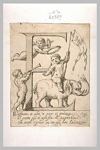 POP | Plateforme ouverte du patrimoineLa lettre E ornée de trois enfants dont un monté sur un éléphant