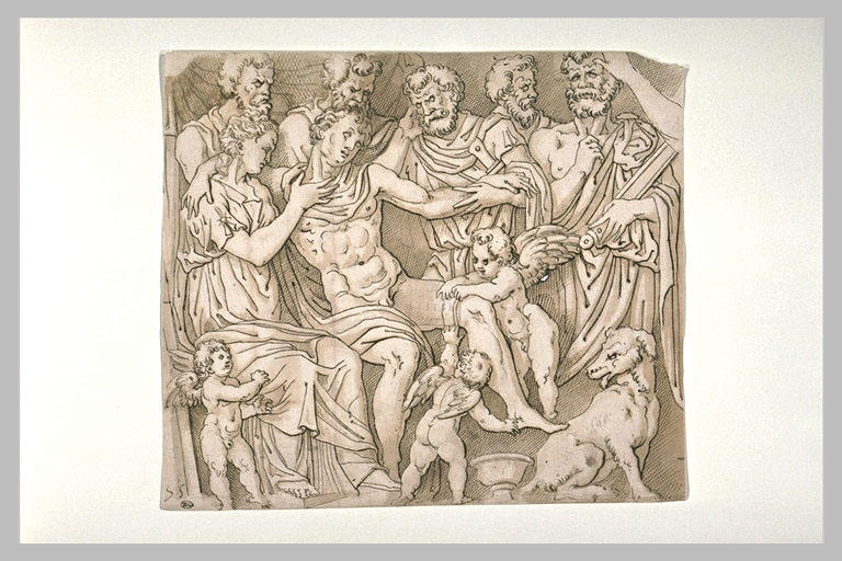 Jeune homme nu, soutenu par une femme, et entouré de cinq vieillards