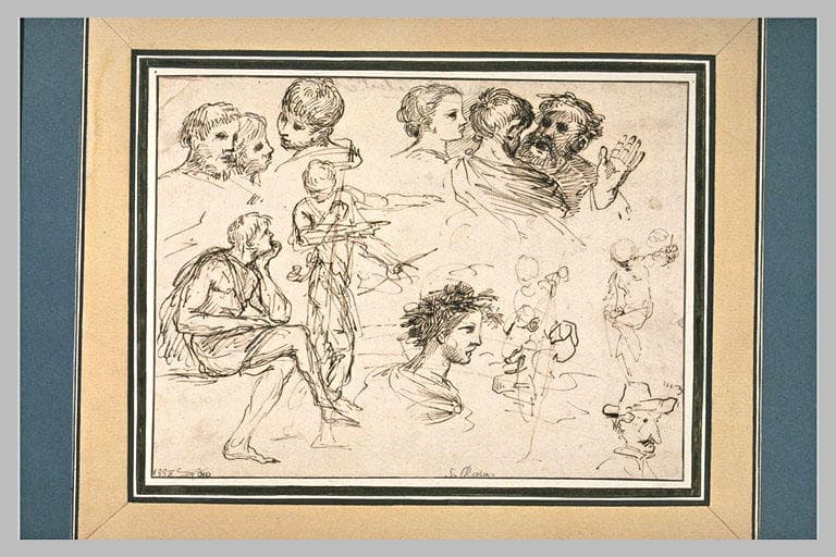 Etudes de groupes de têtes, d'une caricature, d'un homme assis et un debout