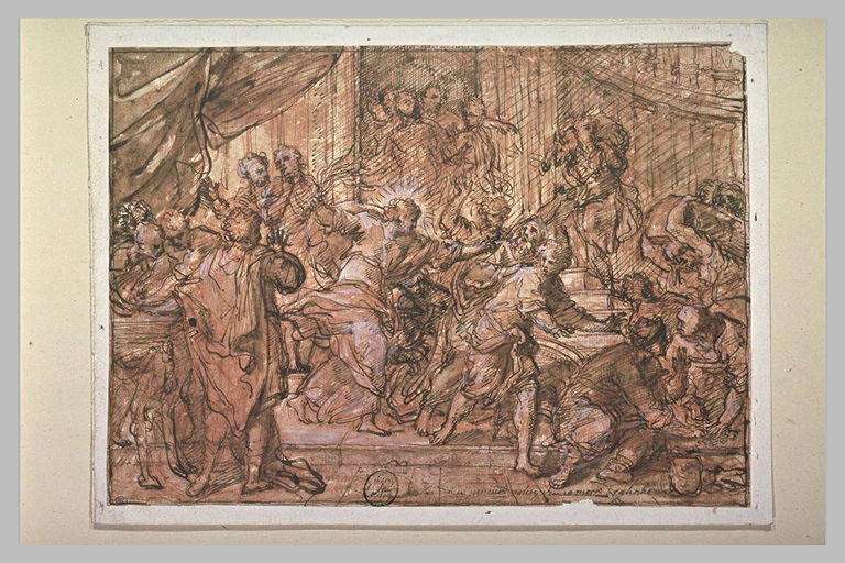 Etude pour la composition avec de nombreuses variantes d'une peinture conservée aujourd'hui à la Walters Art Gallery de Baltimore (R. Bacou et J. Bean, Le dessin à Rome au XVIIe siècle, Paris, Musée du Louvre, 1988, n° 108)