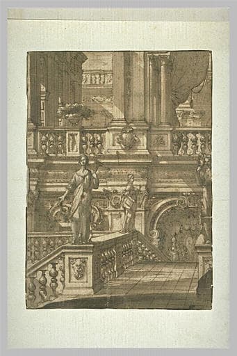 Etude d'un palier d'escalier de palais, avec une statue de la Renommée