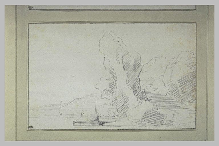 POP | Plateforme ouverte du patrimoineAu bord d'un lac, un bateau à l'ancre sous un rocher très découpé