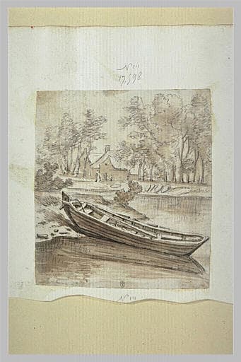 POP | Plateforme ouverte du patrimoineBarque sur la berge, amarrée devant des bâtiments entourés d'arbres