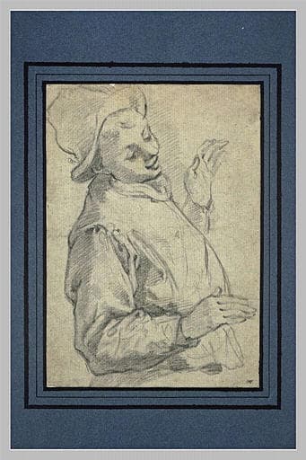 Homme à mi-corps, coiffé d'un chapeau, de trois quart vers la droite