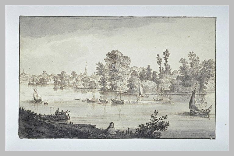 Barques sur une rivière aux berges boisées, avec une ville dans le lointain
