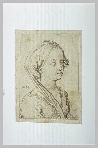Buste de jeune fille, de trois quarts à droite, un bijou dans les cheveux