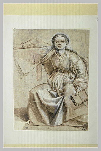 figure mythologique (Clio, assis, de face, draperie, portant, livre : ouvert)