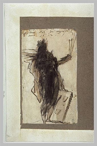 Une figure debout, tenant un objet à chaque main