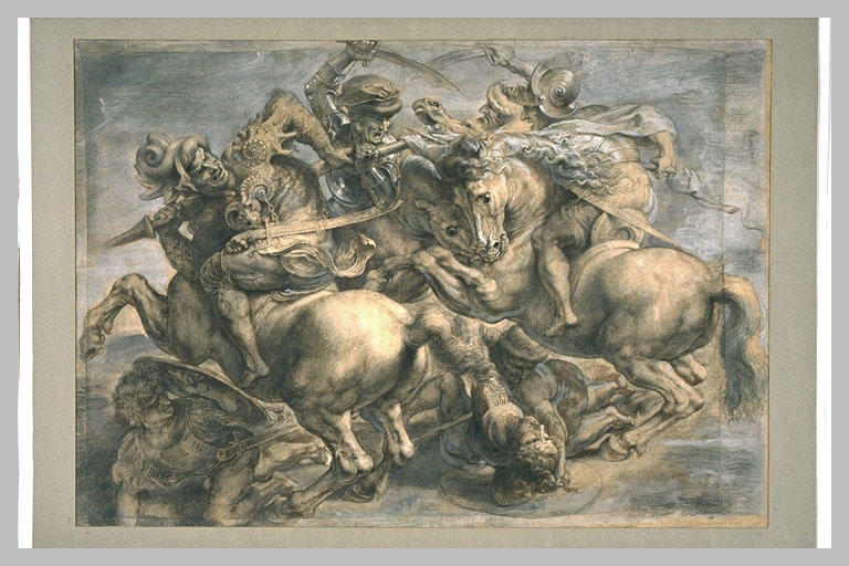 Ce dessin, de dimensions exceptionnelles, est la plus célèbre des interprétations que l'on ait conservées de la Bataille d'Anghiari de 1504-1505, fresque de Léonard pour le Palazzo della Signoria à Florence, aujourd'hui disparue. Rubens, qui voyagea en Italie entre 1600 et 1608, ne vit pas l'esquisse de la Bataille, détruite vers 1560. Toutefois il eut accès aux dessins de Léonard de Vinci et les étudia. Selon A.-M. Logan (dans cat. exp. Léonard de Vinci, dessins et manuscrits, Paris, Musée du Louvre, 2003, n° 103), l'artiste aurait acquis un dessin reproduisant, d'après un prototype disparu, la composition demeurée inachevée : c'est le feuillet d'origine du dessin du Louvre. Le dessin aurait été repris par une ou plusieurs mains, avant d'être largement retouché et agrandi par Rubens