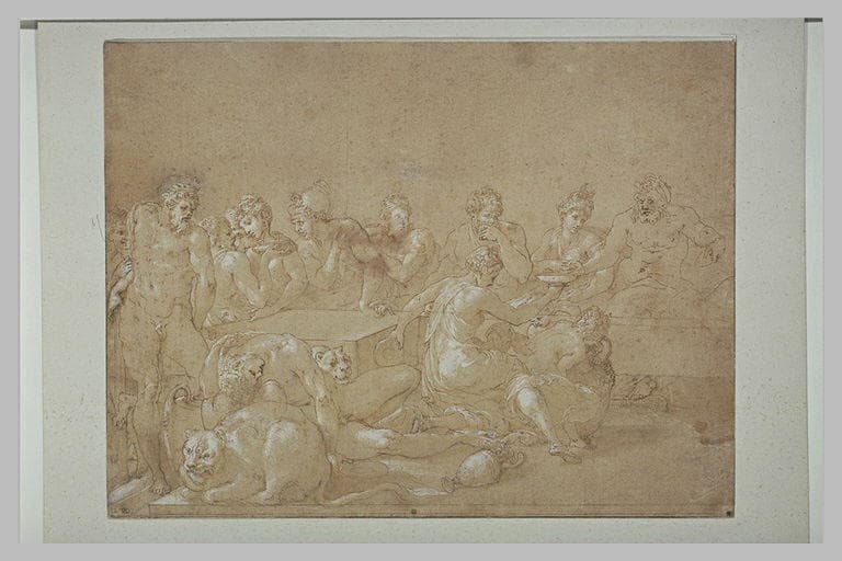 Il s'agit de la moitié gauche de l'étude pour le Festin des dieux, l'une des deux grandes peintures qui figuraient dans le compartiment central de la Galerie d'Ulysse, au château de Fontainebleau. La moitié droite du Festin a été élaborée sur une autre feuille du Louvre (Inv. RF 36580), tandis que l'ensemble de l'idée nous est connue par une copie (INV 8535). Selon R. Bacou (Trois dons des Amis du Louvre: Primatice, Jordaens, Callot. ., La Revue du Louvre, n° 4, 1980, p. 249-251) la composition daterait de 1548 environ. S. Béguin (in R. Bacou op. cit. p. 166) envisage une exécution en deux temps : 1541-1547 pour les éléments à la plume ; 1555-1560 pour la figure ajoutée au crayon de l'Inv. RF 36580. Le caractère grandiose de la composition et l'originalité de la synthèse des sources raphaélesque et michelangelesque (cf. en particulier INV 686 du Louvre), suggèrent à V. Romani (in cat. exp. Primatice, maître de Fontainebleau, Paris, Musée du Louvre, 2004, n° 151) une date autour de 1548-1550.