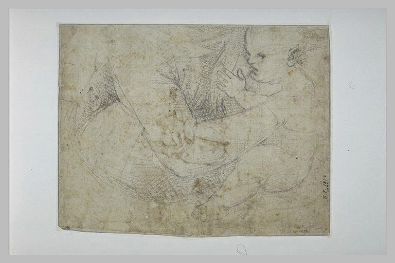 Etude, où manquent les épaules, le cou, et la tête de la femme, pour une Madonna Lactans perdue ou non réalisée. D. Cordellier, B. Py, Musée du Louvre - Inventaire des dessins italiens - V. Raphaël, son atelier, ses copistes, Paris, 1992.