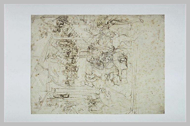 Projet d'ensemble pour l'Adoration des Mages, conservée aux Offices, commandée en mars 1481 pour le couvent de San Donato a Scopeto et restée inachevée au départ de Léonard de Vinci pour Milan