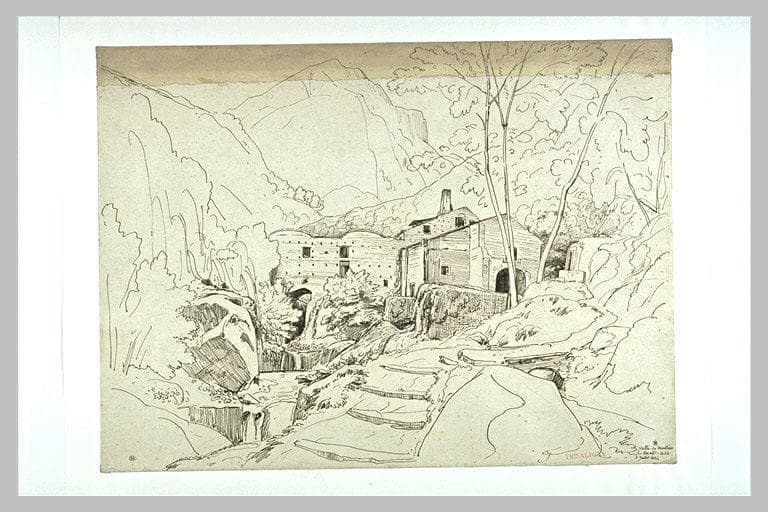 Des moulins, parmi des arbres, dans un vallon qui suit un ruisseau