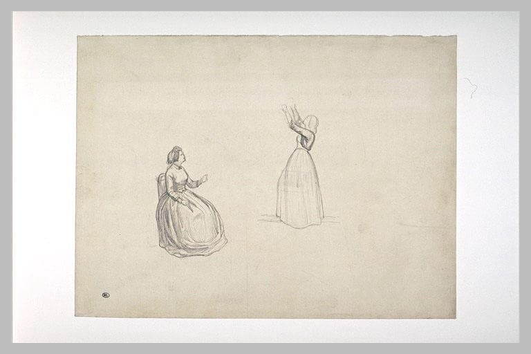 Femme coiffée d'un bonnet, assise ; femme, debout, levant les bras