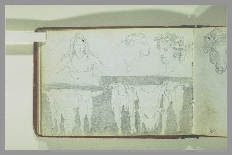 Le buste de femme est un détail d'une fontaine antique en forme de trépied et conservée au Musée du Louvre, Paris. La peau de bouc est au fond d'un siège consécré à Bacchus, également au Louvre. Ces études ont servi de préliminaires pour la décoration de la salle à manger de l'Hôtel de Talma, à Paris.