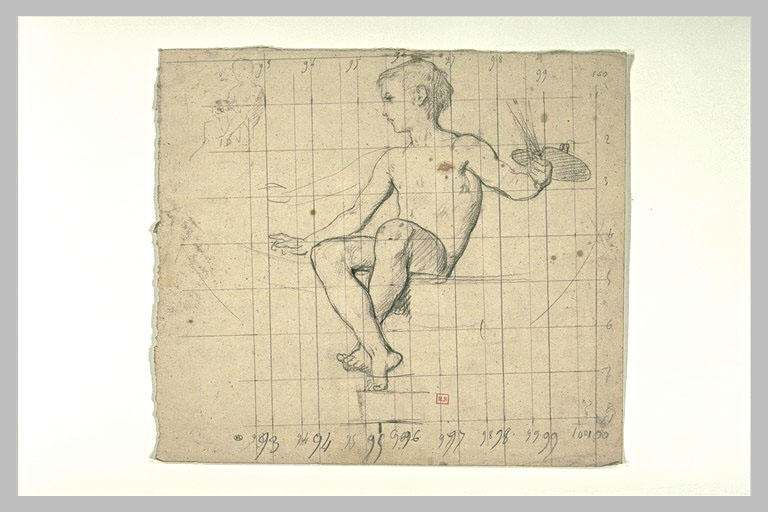 Enfant, assis, de trois quarts à gauche, tenant une palette