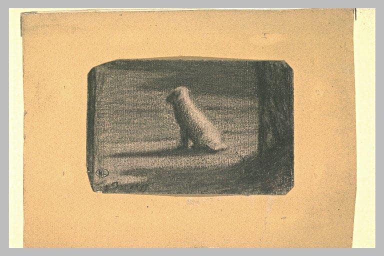 POP | Plateforme ouverte du patrimoineChien assis, de dos, tourné vers la gauche, près d'un tronc d'arbre